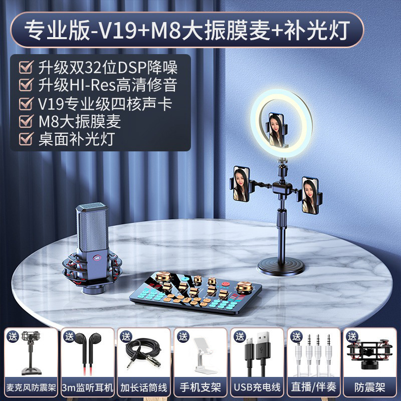 【专业款】V19声卡M8大振膜麦+声卡配件全套+桌面补光灯