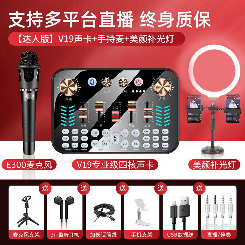 【专业款】V19声卡+E300麦+声卡配件全套+桌面补光灯