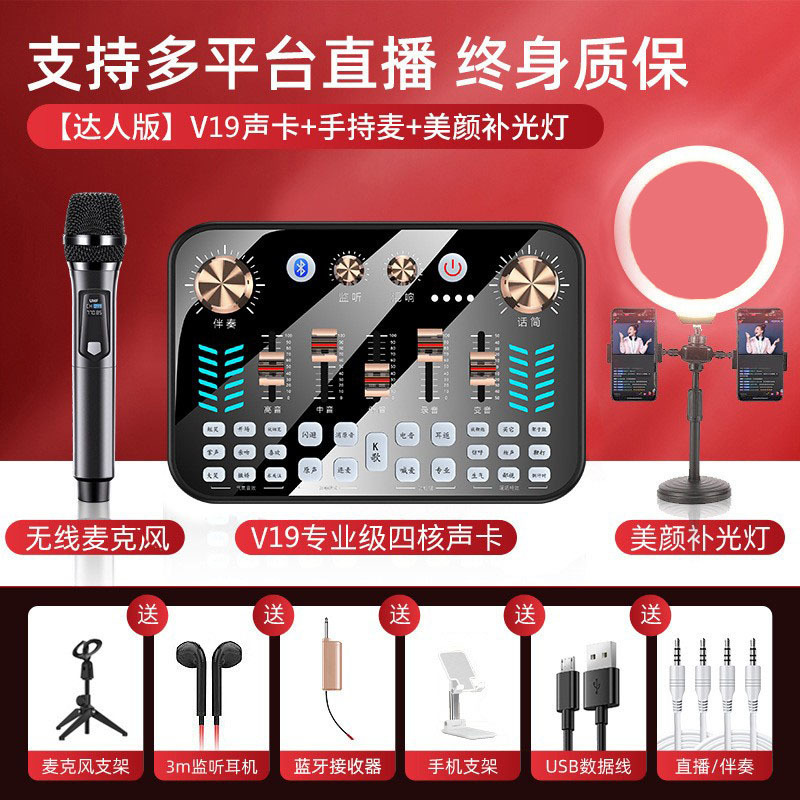 【专业款】V19声卡+无线麦+声卡配件全套+桌面补光灯