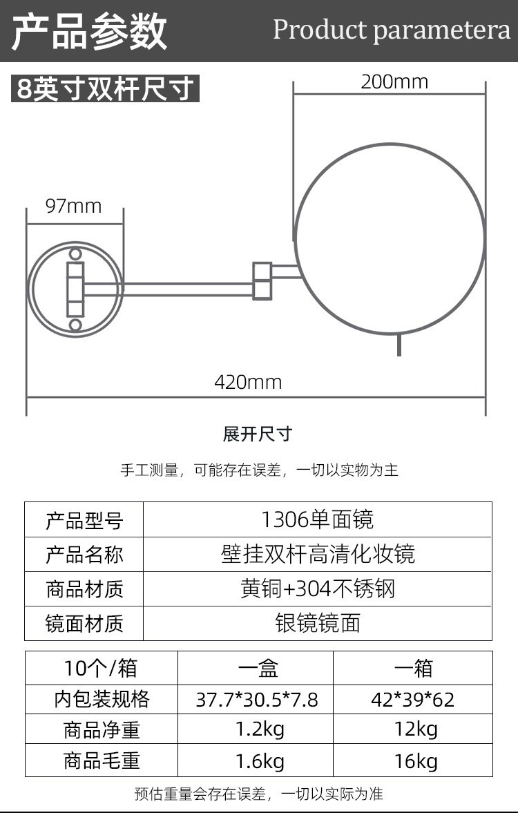 size: 8-inch 3-fold magnifying glass, 8-inch plane mirror (not put