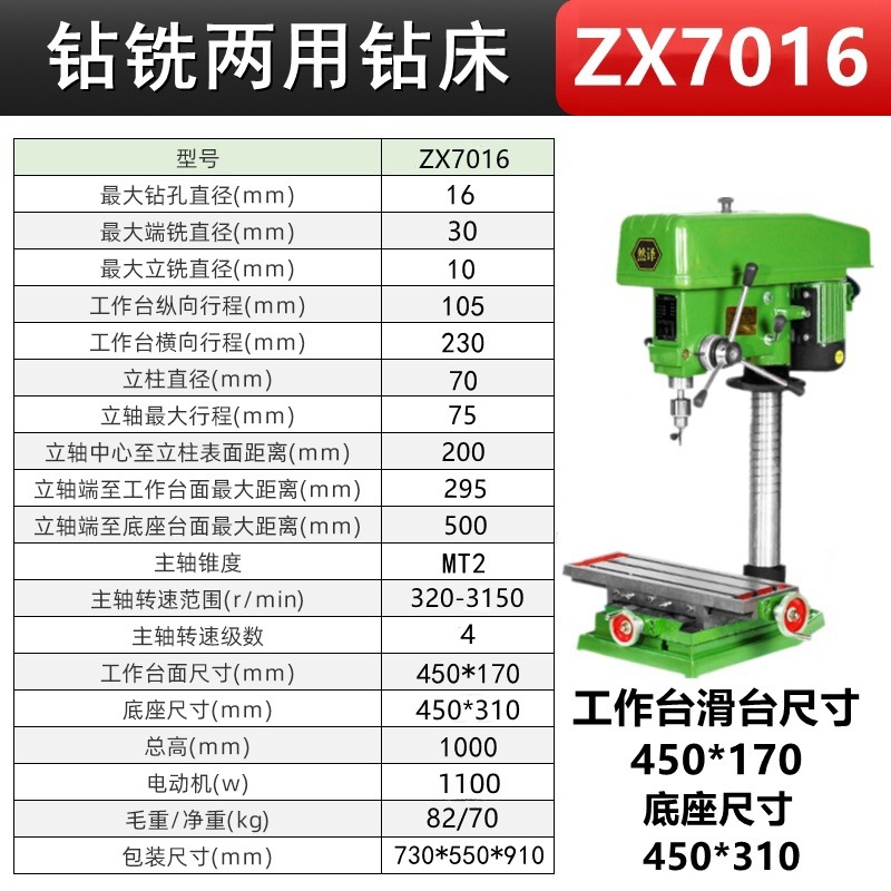 钻孔铣床7016/三相380V+铜1100W 送4寸平口钳