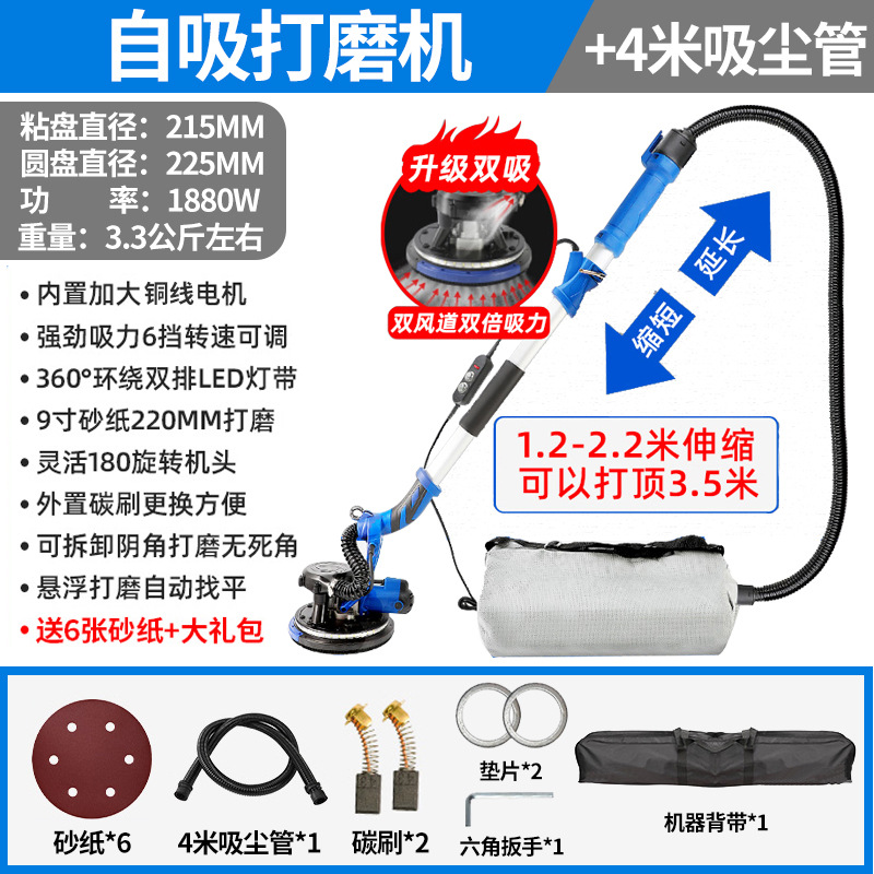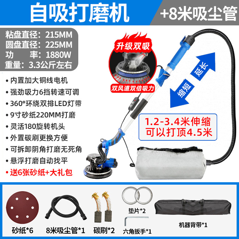 1880W双管吸尘4.5米触高可六档调速+8米吸尘管+6张砂纸