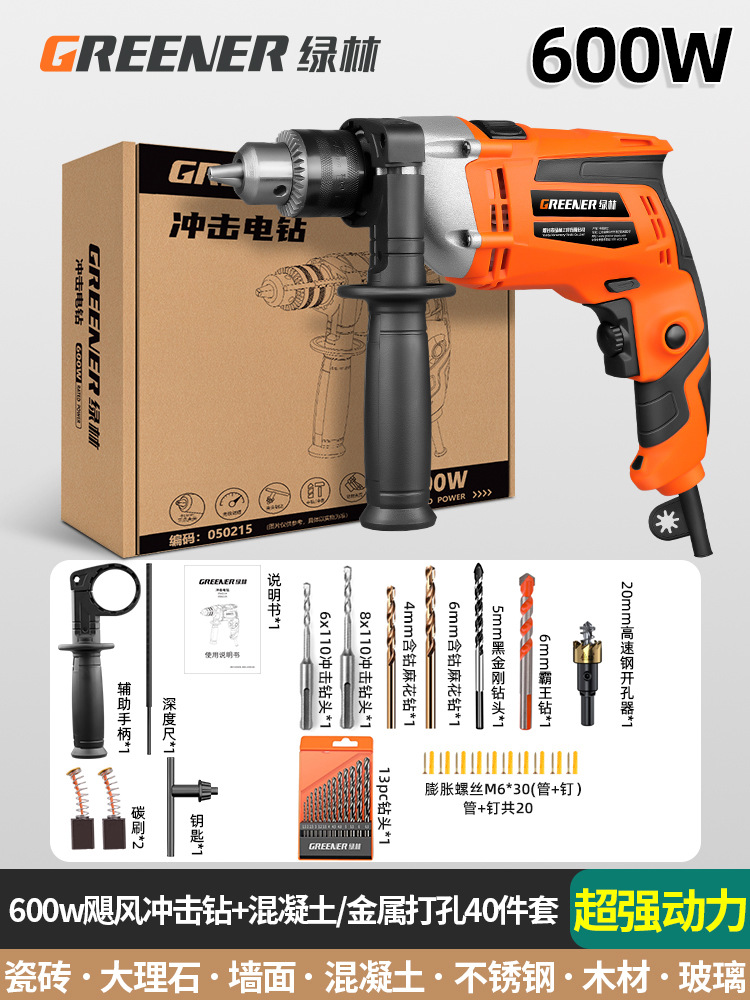 600w超强动力飓风冲击钻+混凝土/金属打孔40件套
