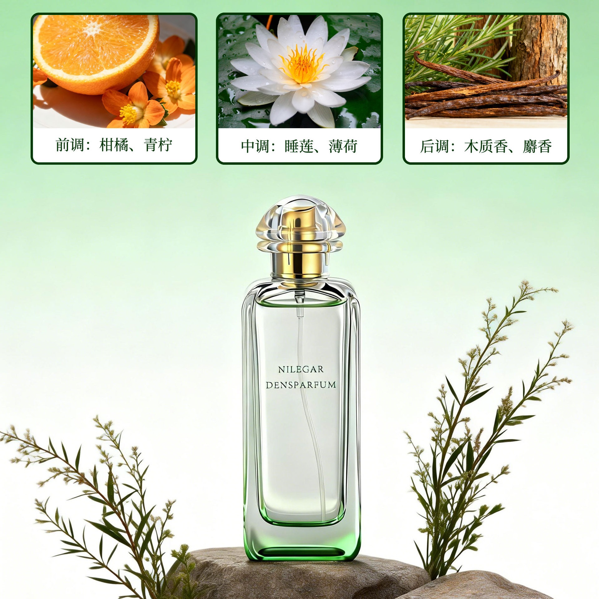 musk scent, mint flavor, lime flavor, citrus flavor, water lily flavor