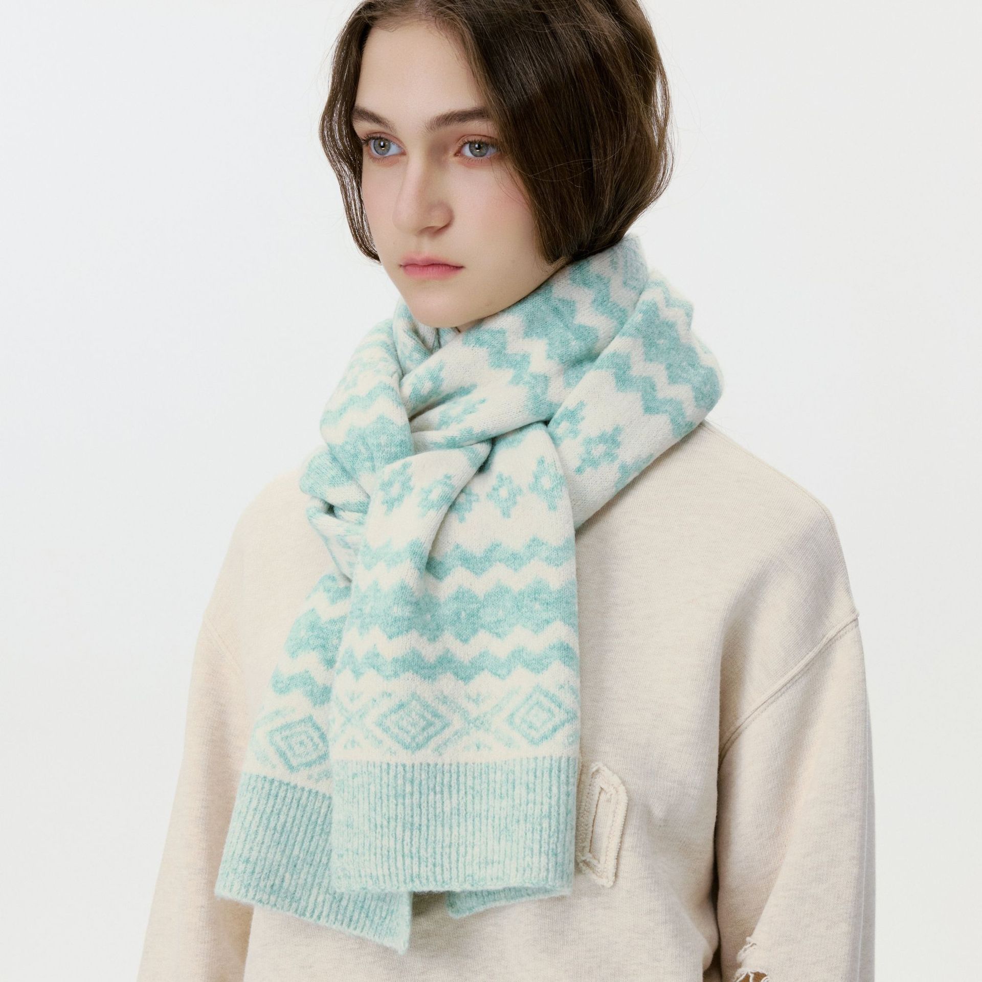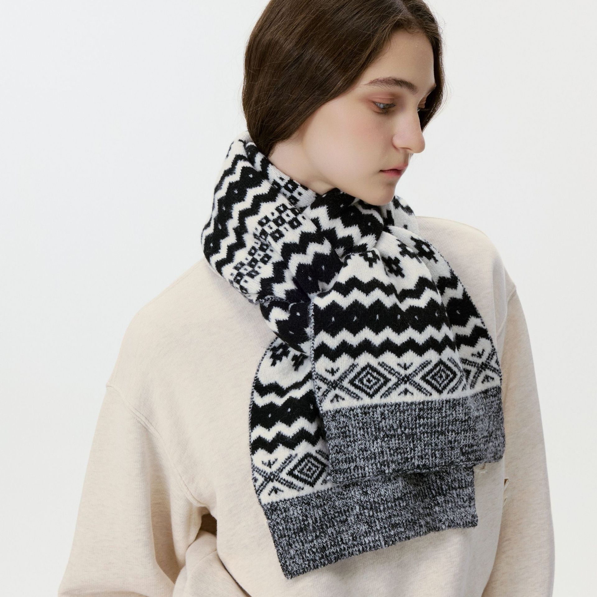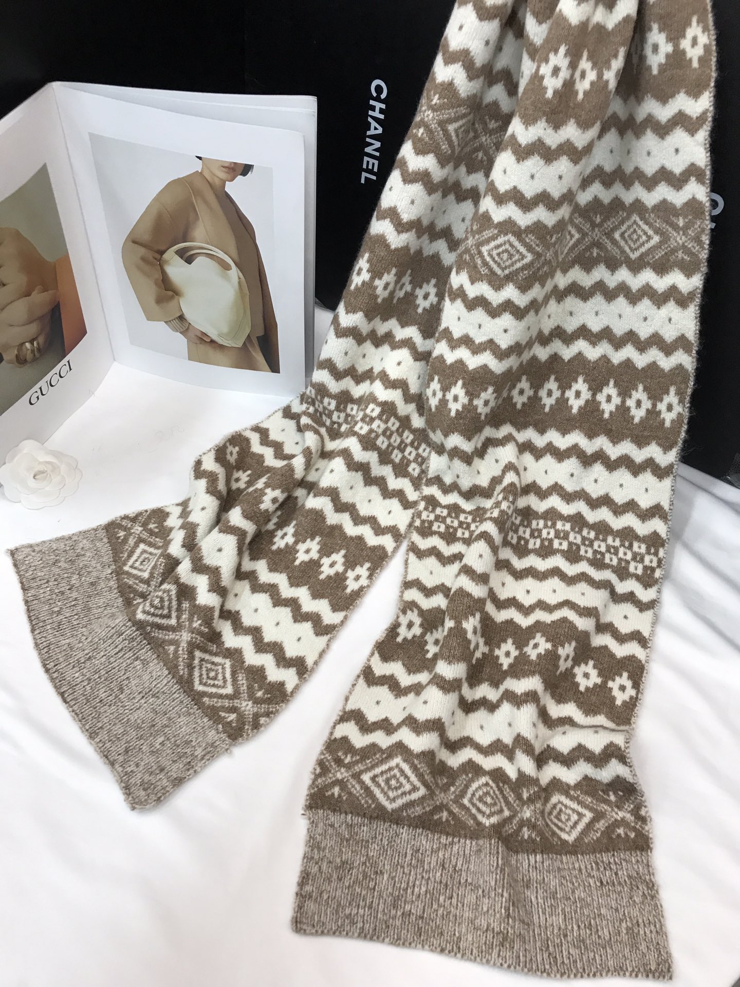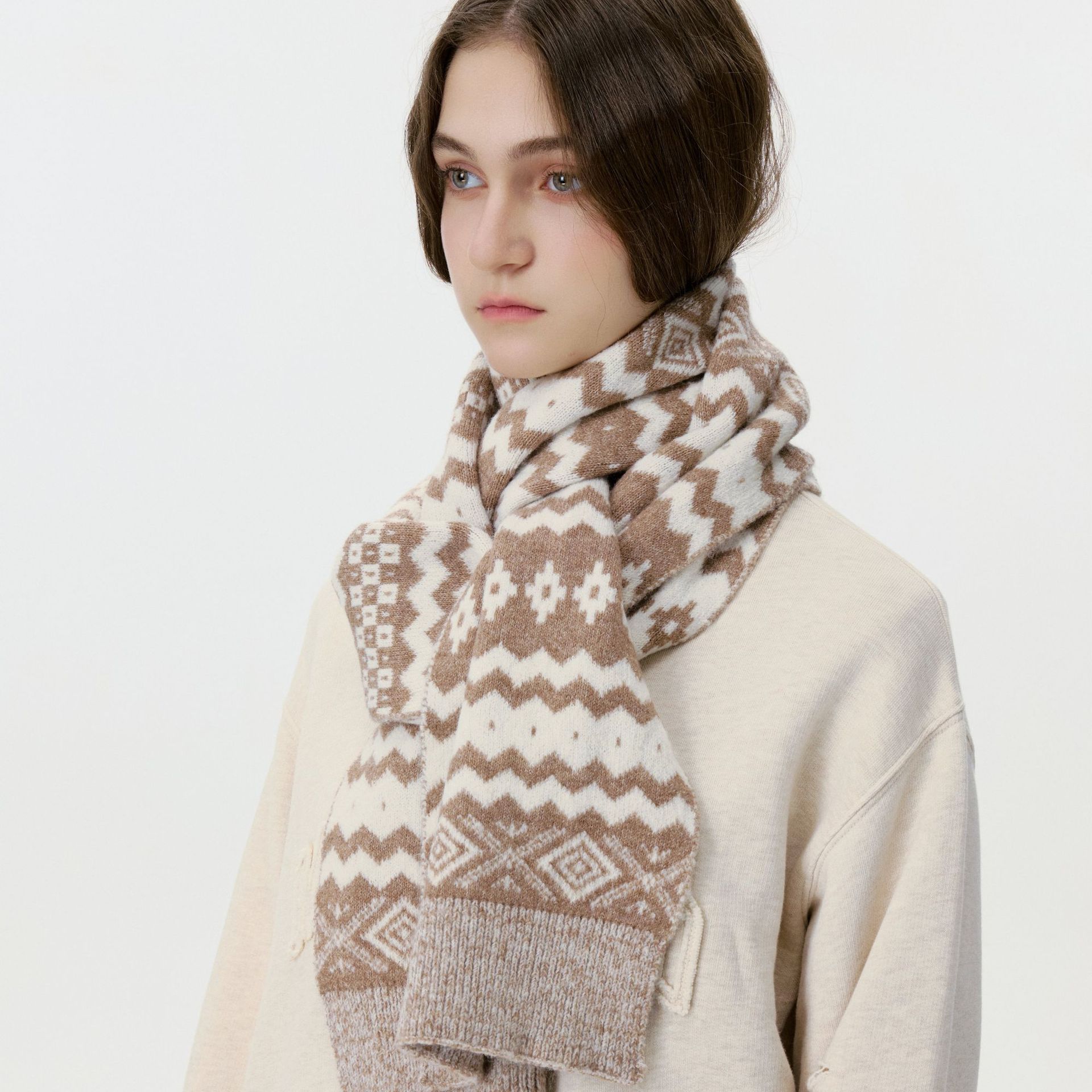 New model, in stock, Fair Isle wool knit, material: 10% wool, nylon, acrylic, polyester blend, size: 30*180, weight: 240g, item number: 04190350