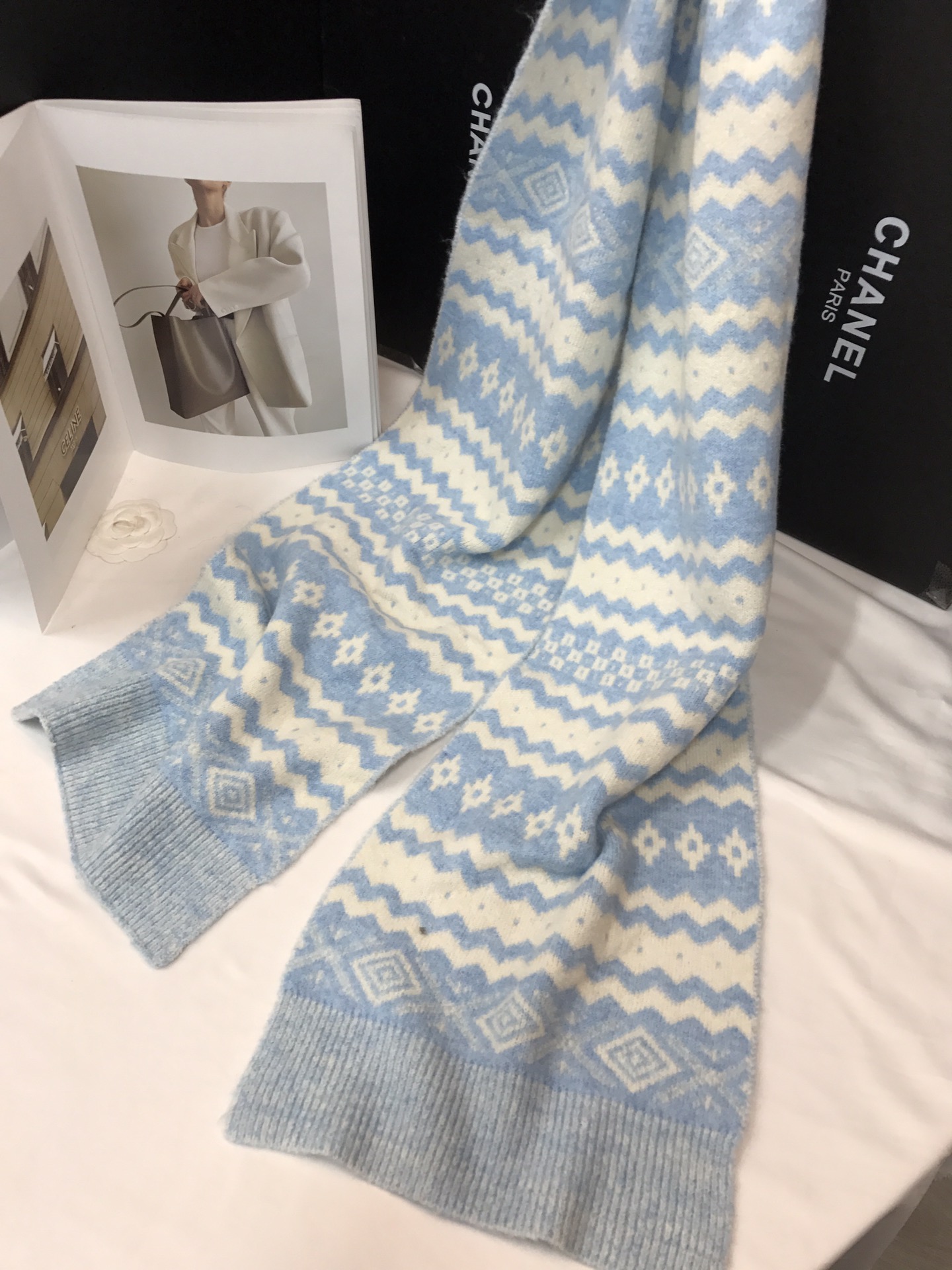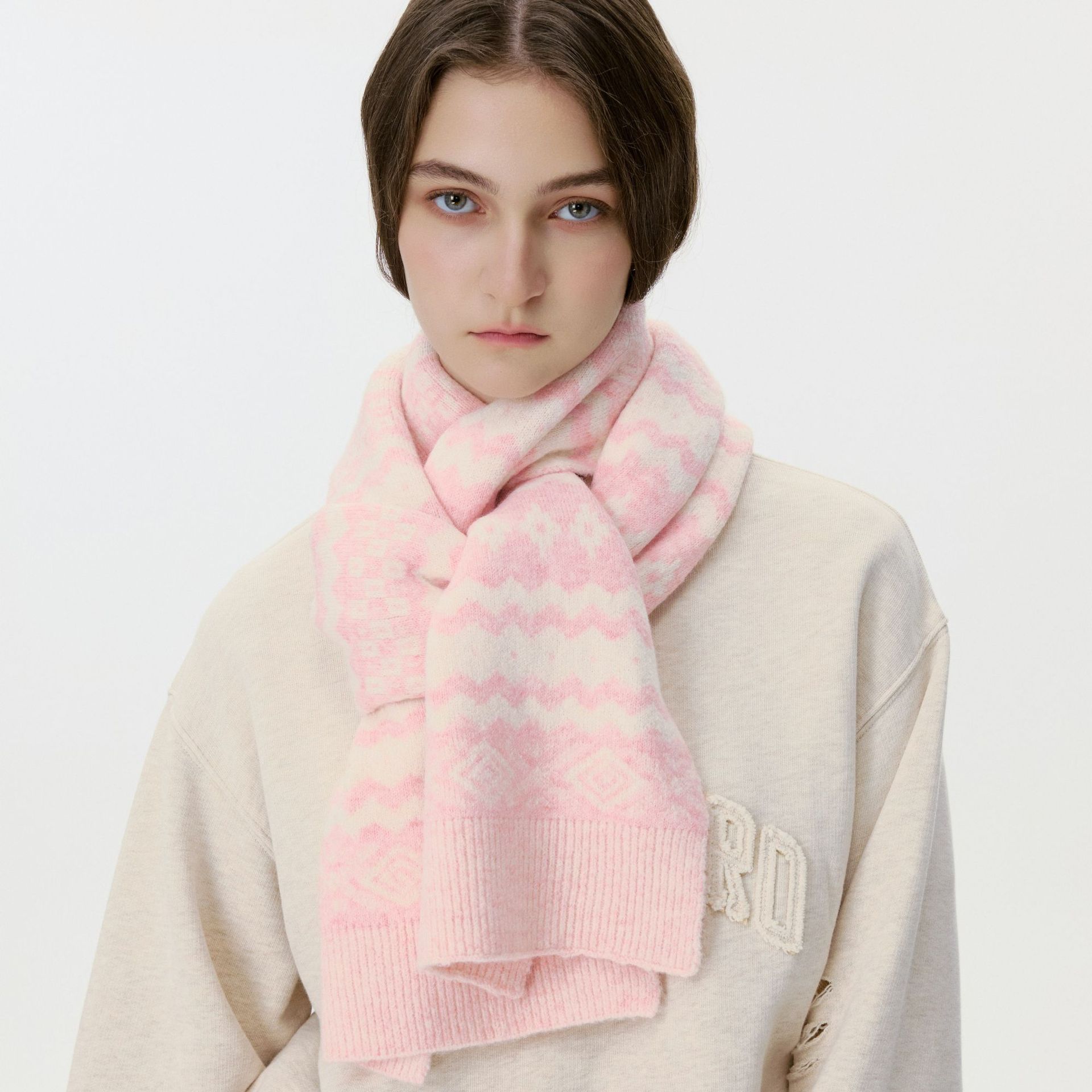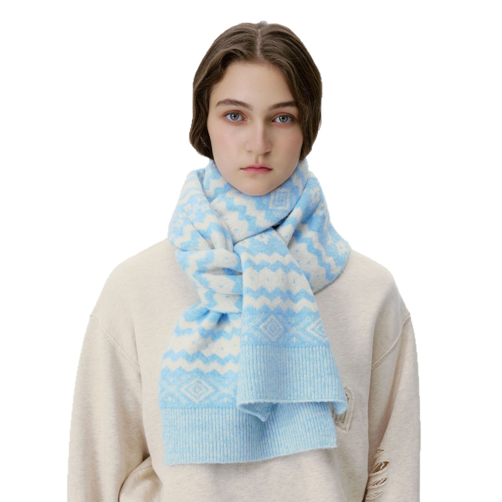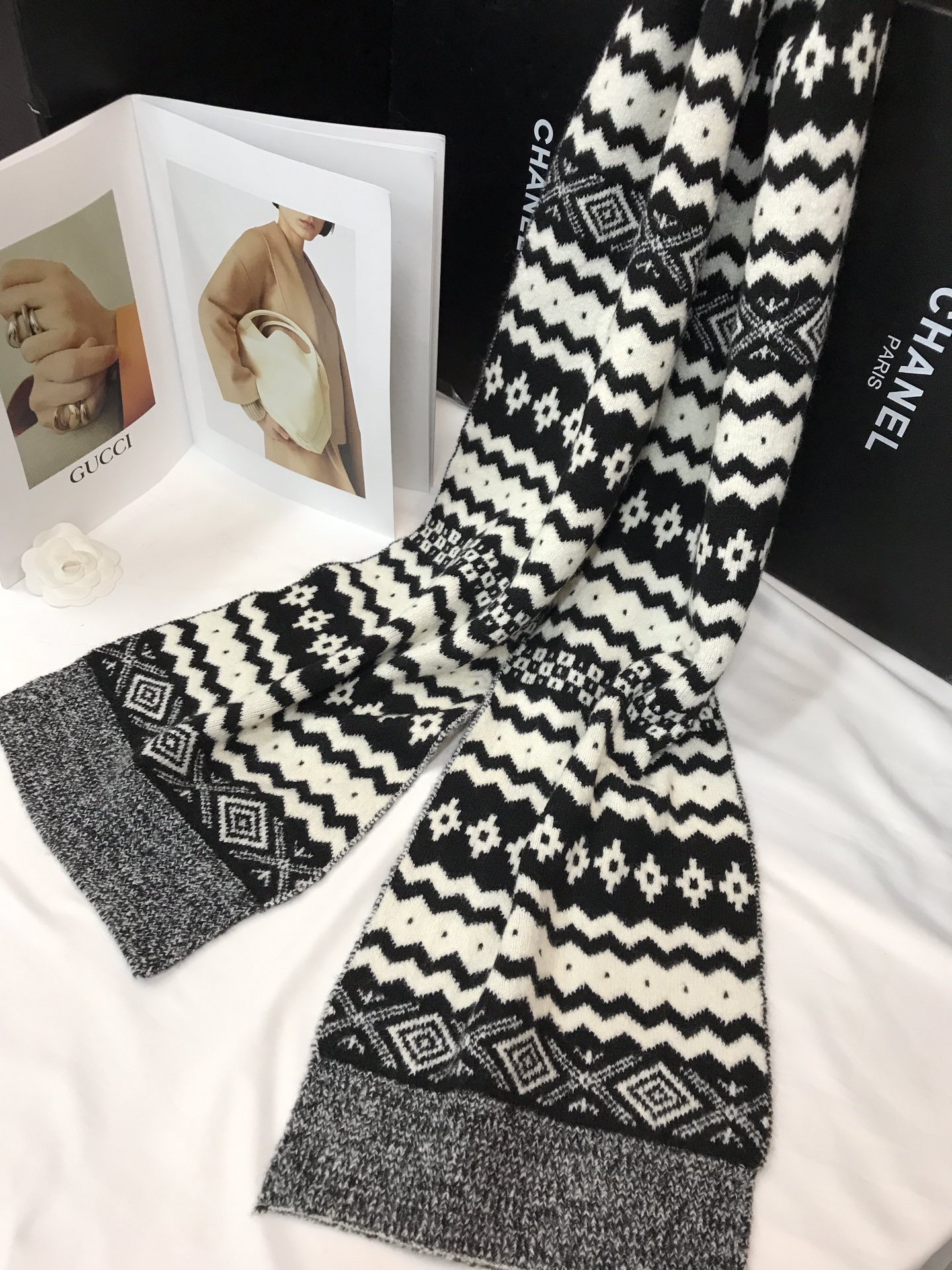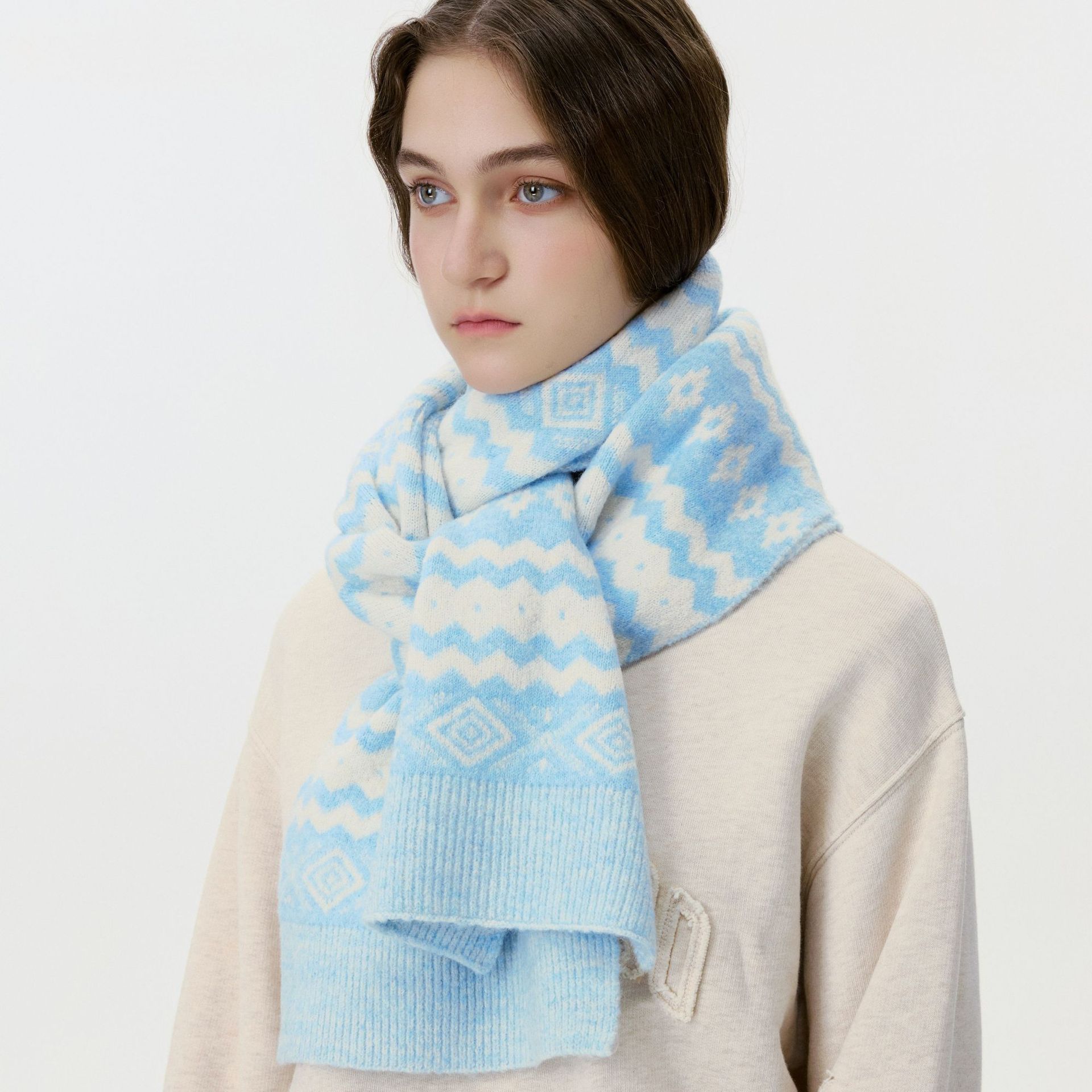 New model, in stock, Fair Isle wool knit, material: 10% wool, nylon, acrylic, polyester blend, size: 30*180, weight: 240g, item number: 04190350
