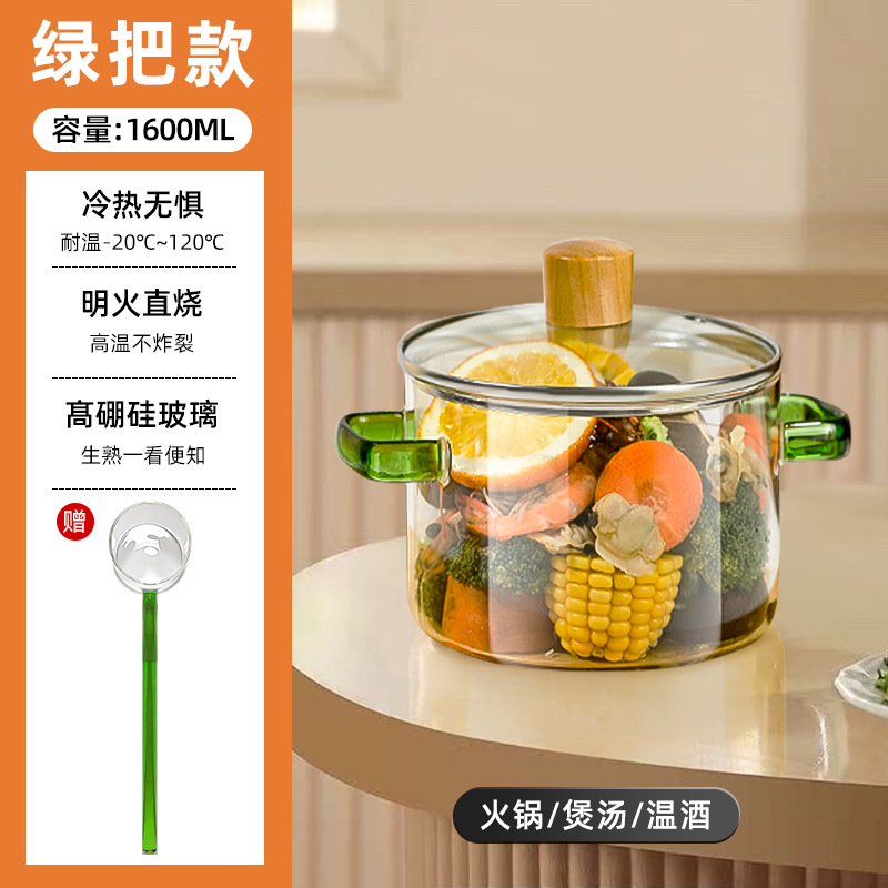 green-handled glass pot 1.6l + green glass spoon (can be heated on open flame/induction cooktop)