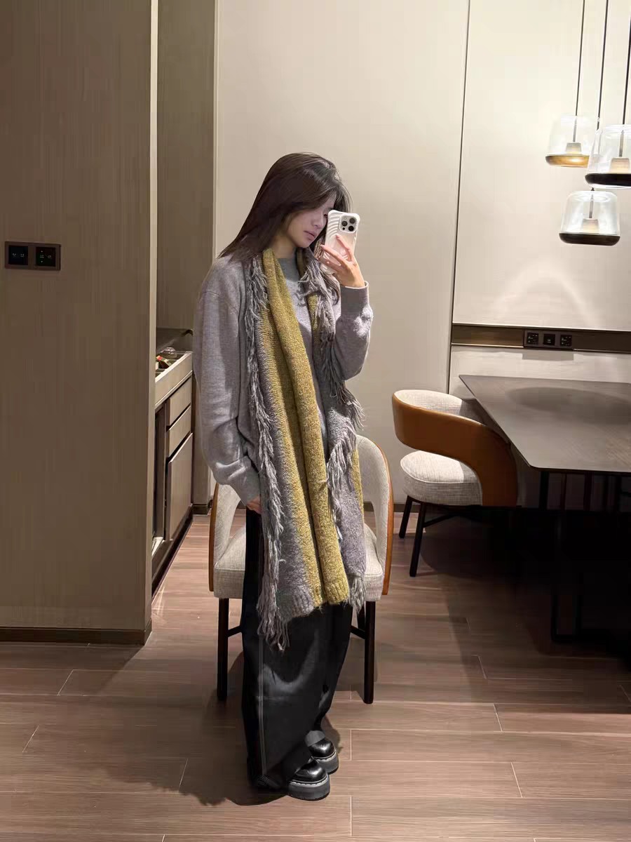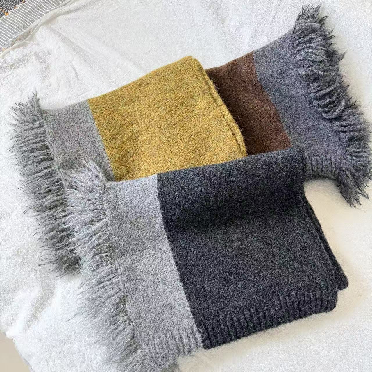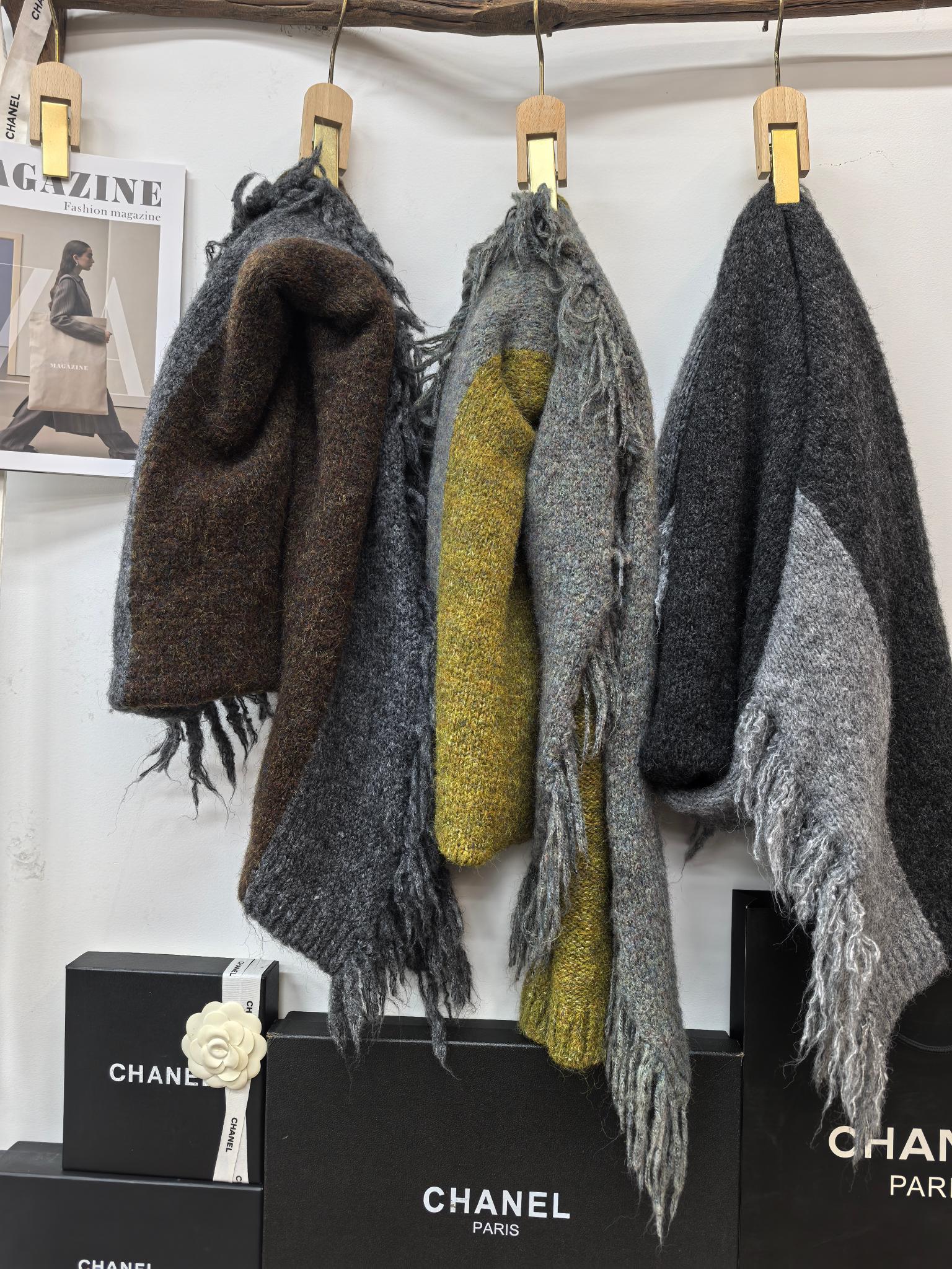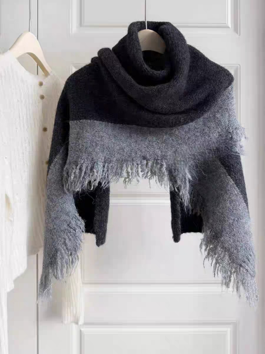 New model, in stock in three colors, dune wind, left and right color blocking, side tassels, wool blend, velveteen tassel contrast color warm knitted scarf, versatile and elegant style shawl, material wool blend, size 40*185, side tassels 10cm, item number 66250420