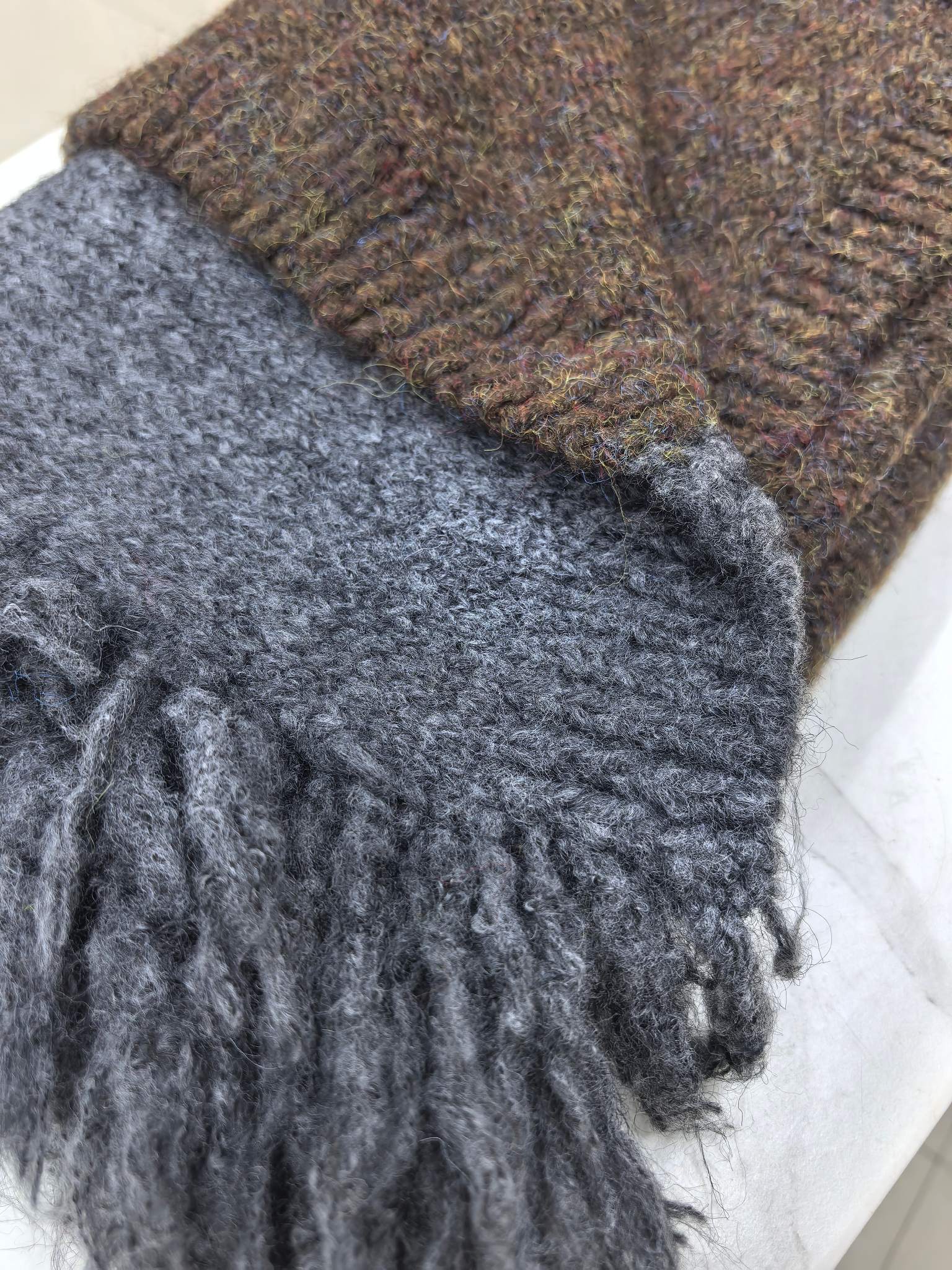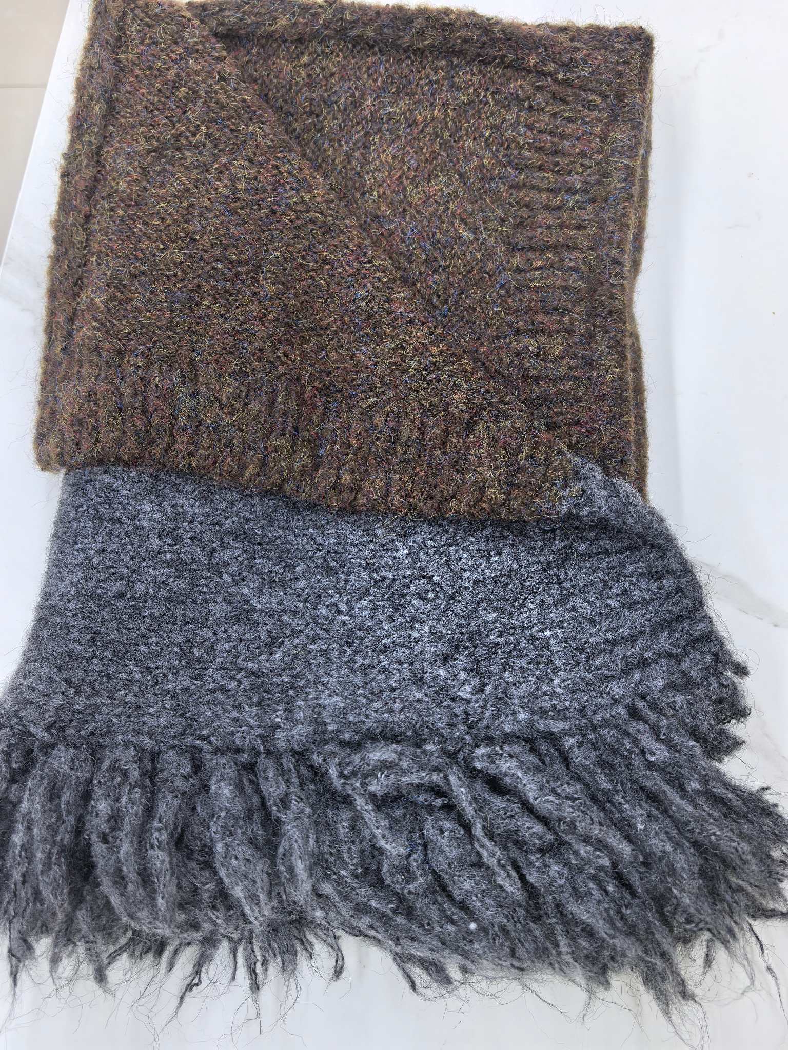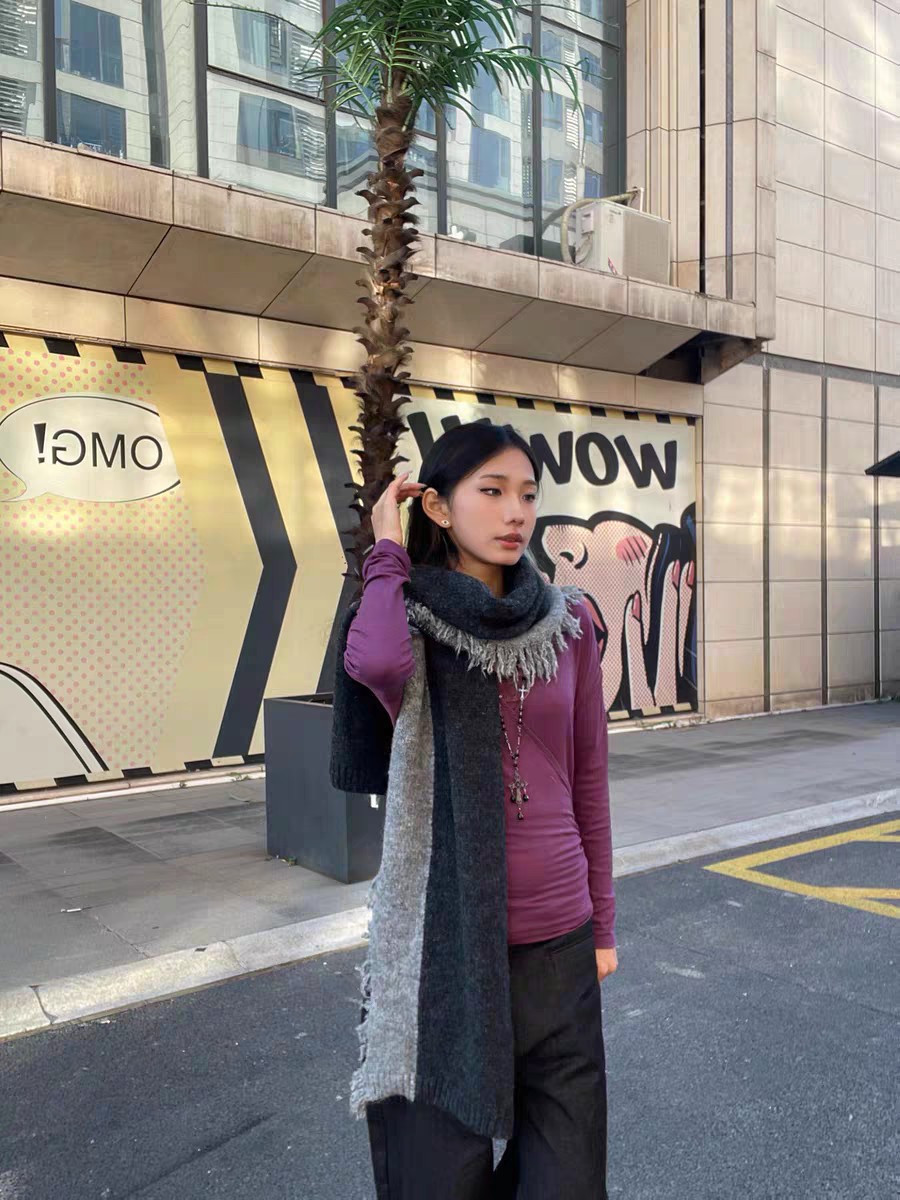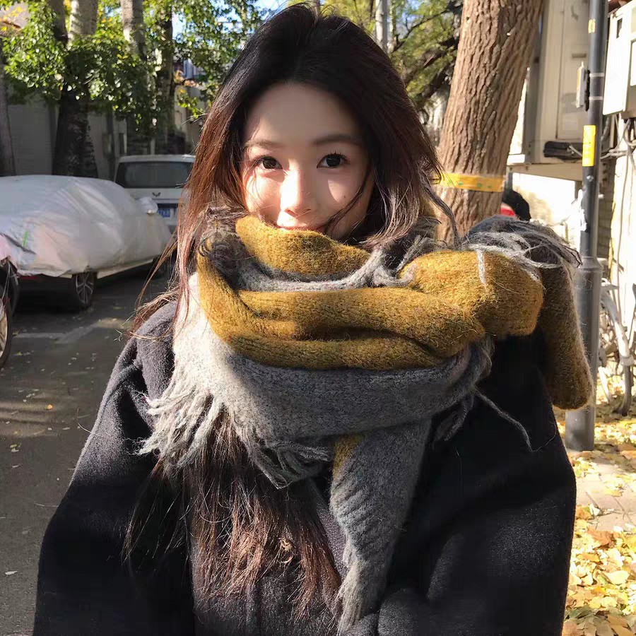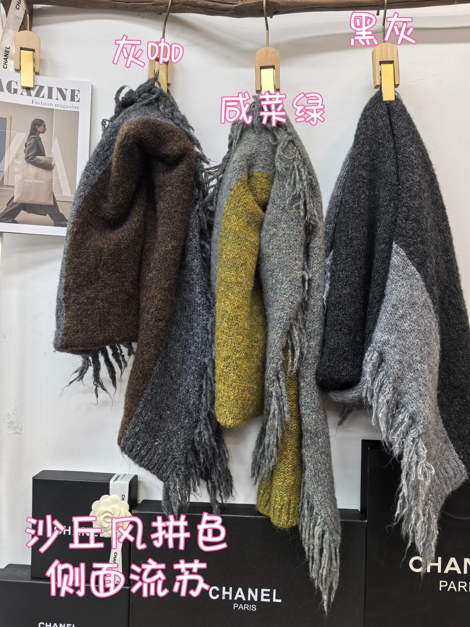 New model, in stock in three colors, dune wind, left and right color blocking, side tassels, wool blend, velveteen tassel contrast color warm knitted scarf, versatile and elegant style shawl, material wool blend, size 40*185, side tassels 10cm, item number 66250420