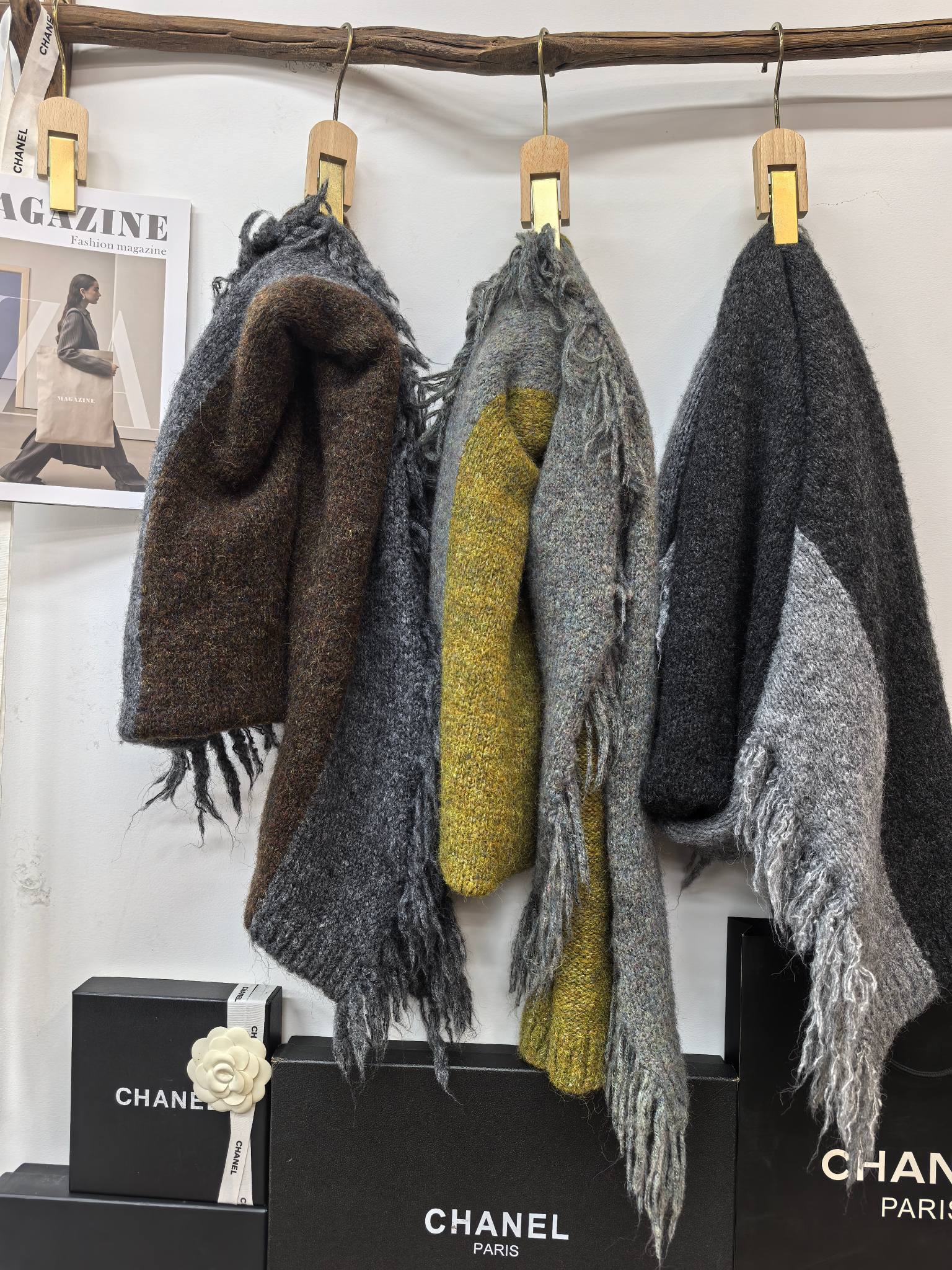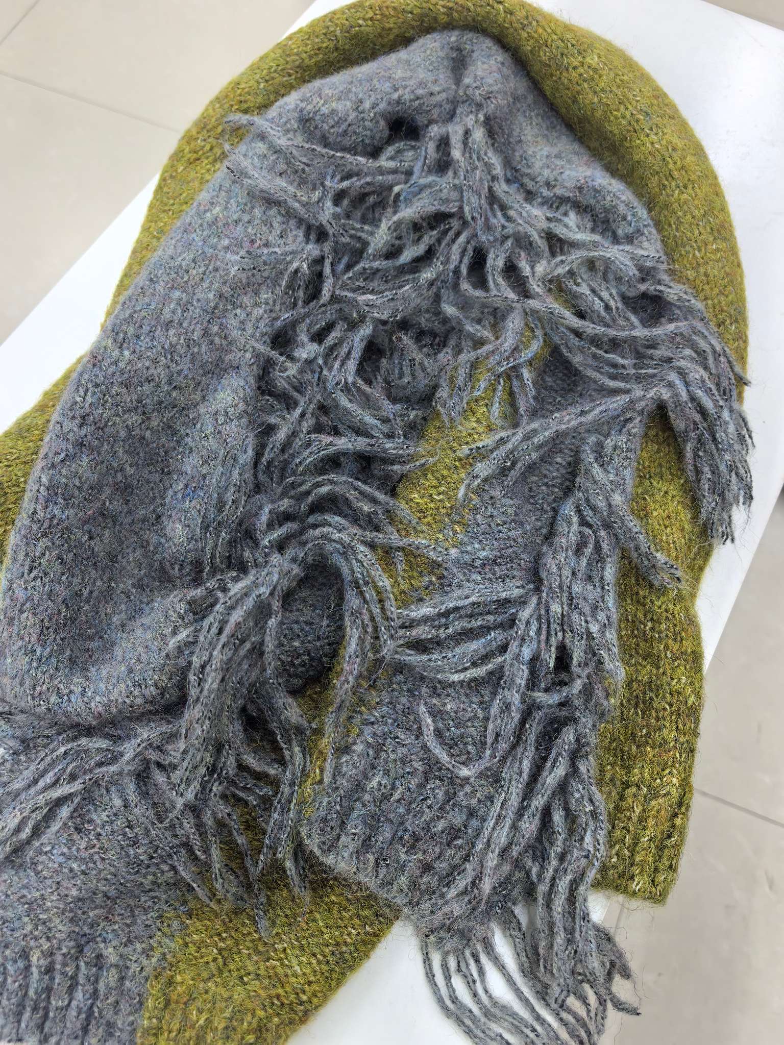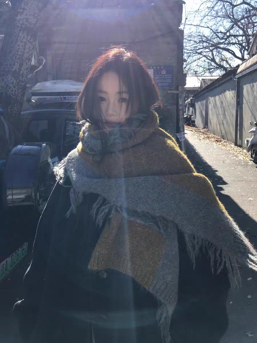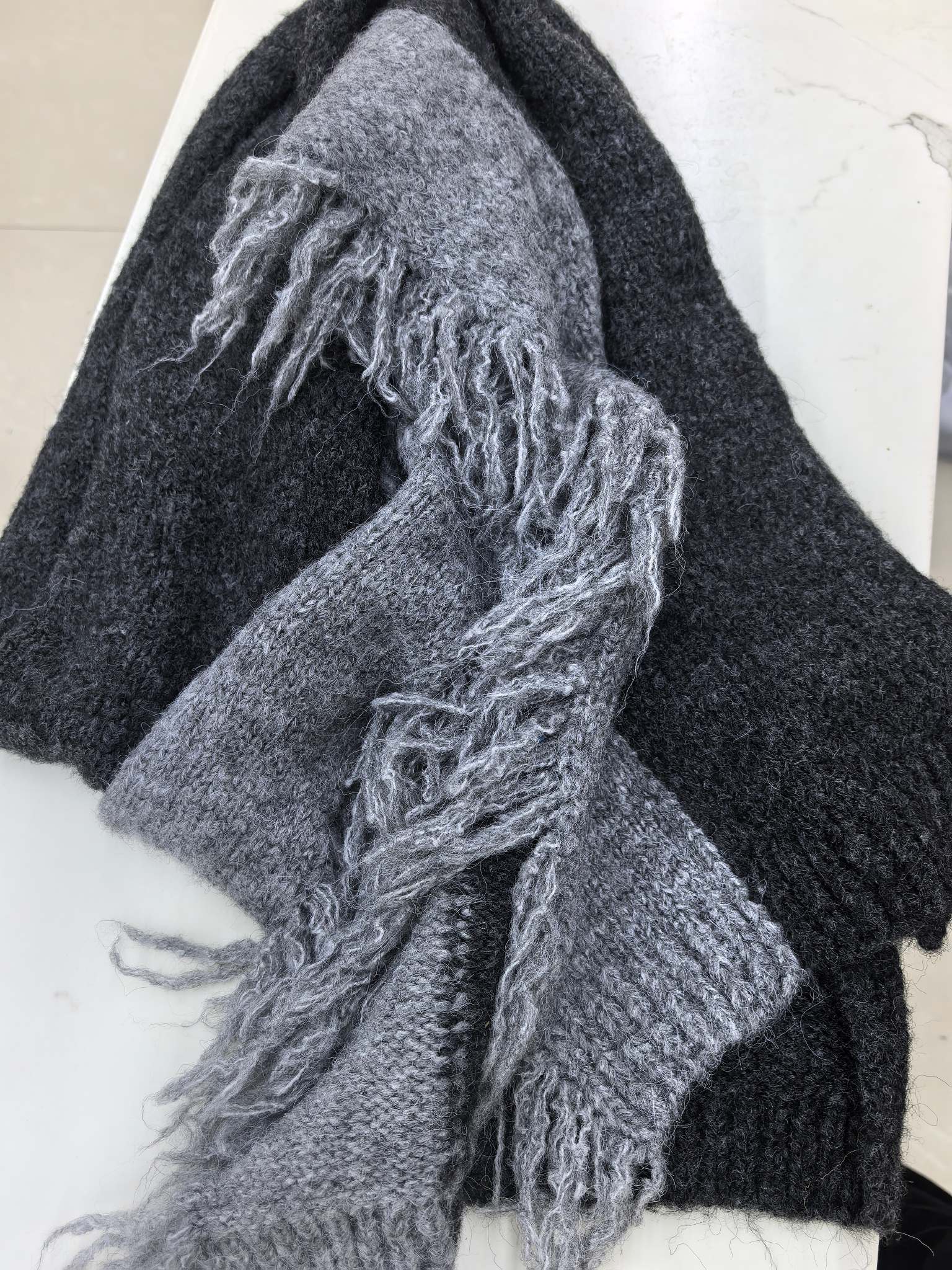 New model, in stock in three colors, dune wind, left and right color blocking, side tassels, wool blend, velveteen tassel contrast color warm knitted scarf, versatile and elegant style shawl, material wool blend, size 40*185, side tassels 10cm, item number 66250420