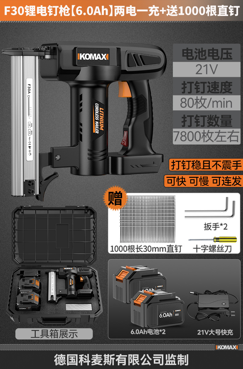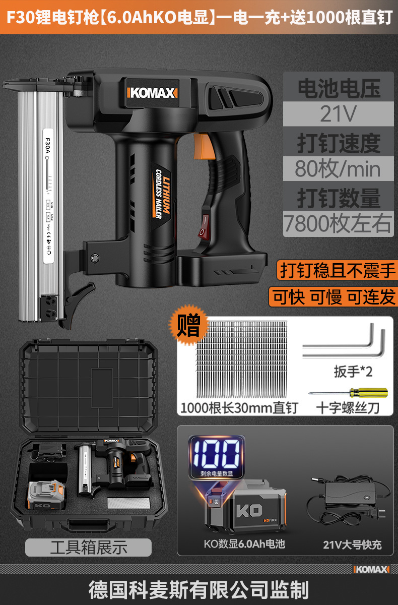 F30锂电钉枪【KO数显6.0Ah】一电一充+送1000根直钉
