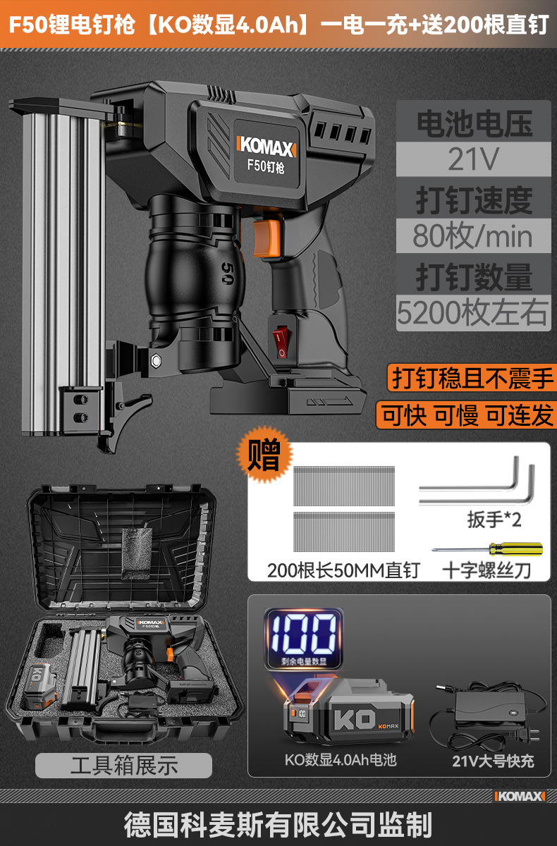 F50锂电钉枪【KO数显4.0Ah】一电一充+送200根直钉