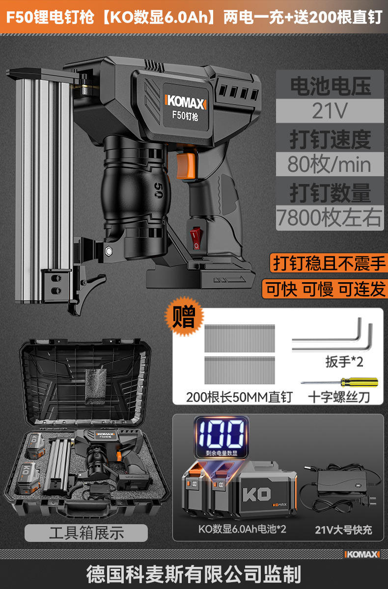 F50锂电钉枪【KO数显6.0Ah】一电一充+送200根直钉