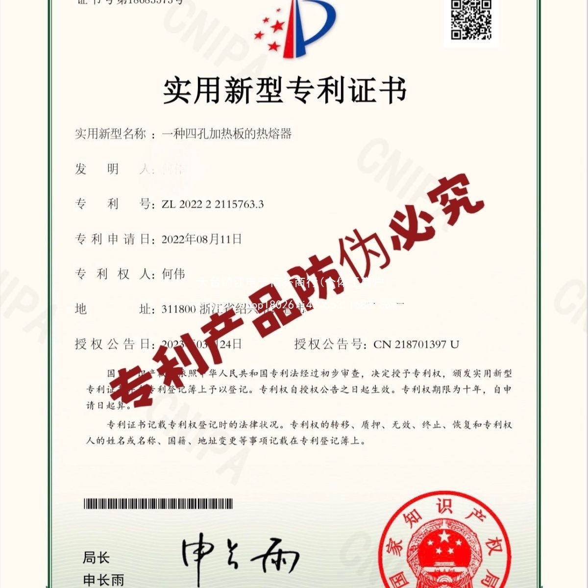 实用专利4孔热容机防伪必究