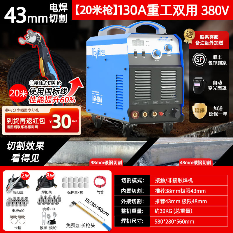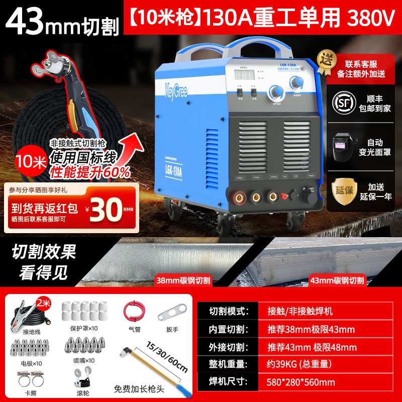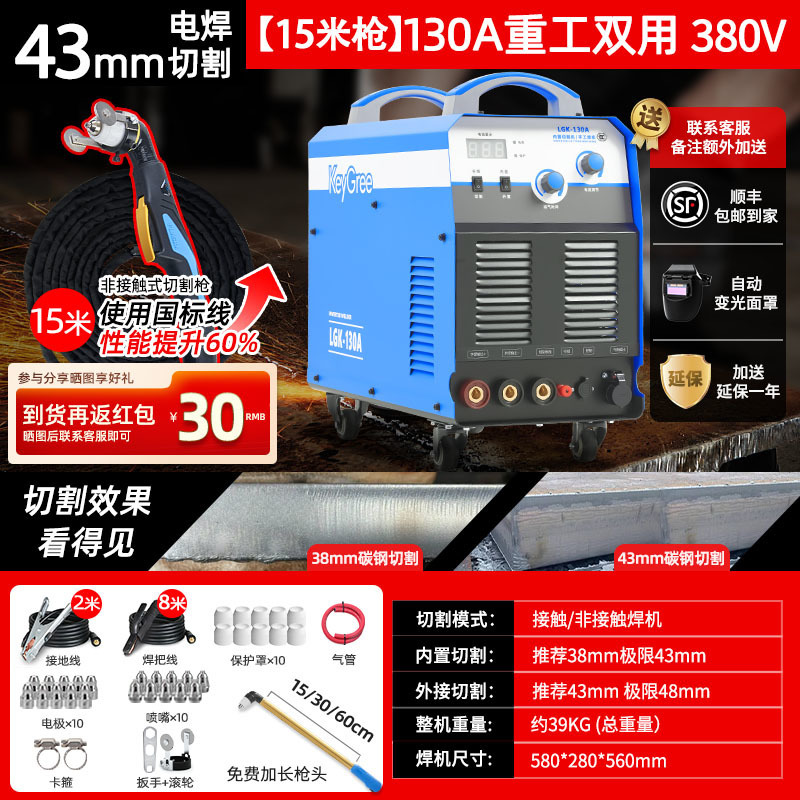 切割厚度43mm+电焊【130】三相电15米-源于欧洲无需空压机接电即切割