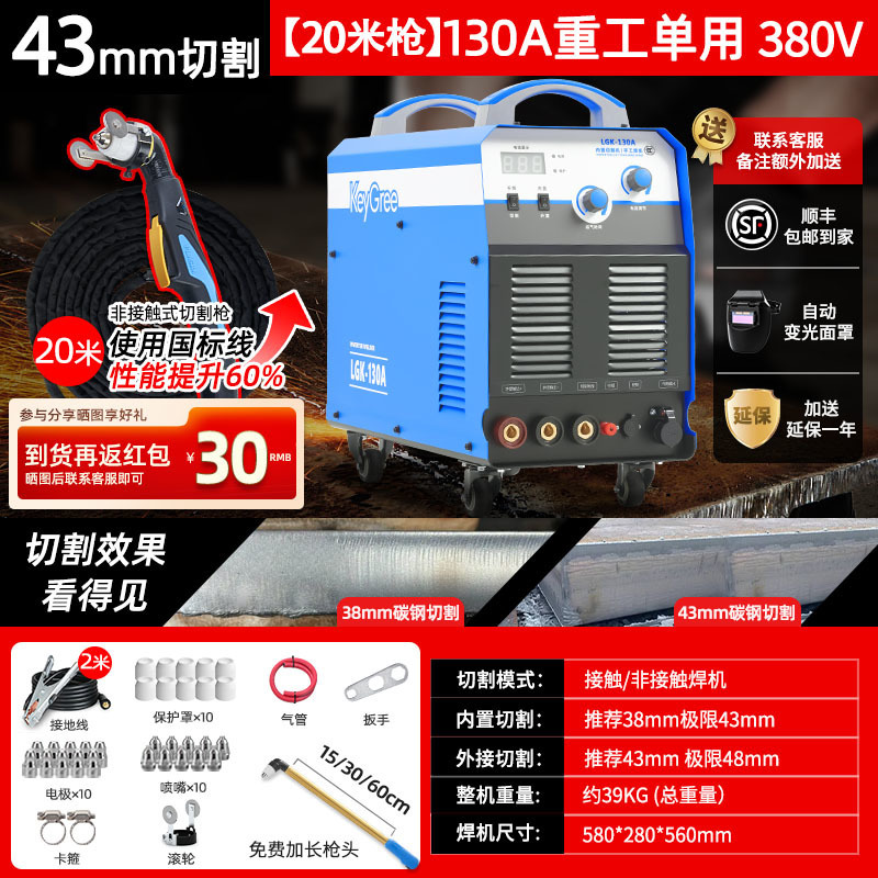 切割厚度43mm+电焊【130】三相电20米-源于欧洲无需空压机接电即切割