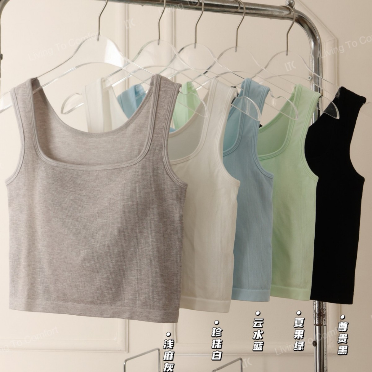 pearl white, light heather gray, summer fruit green, cloud blue, noble black