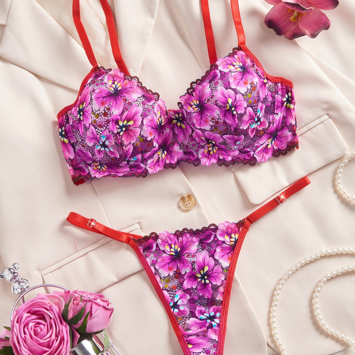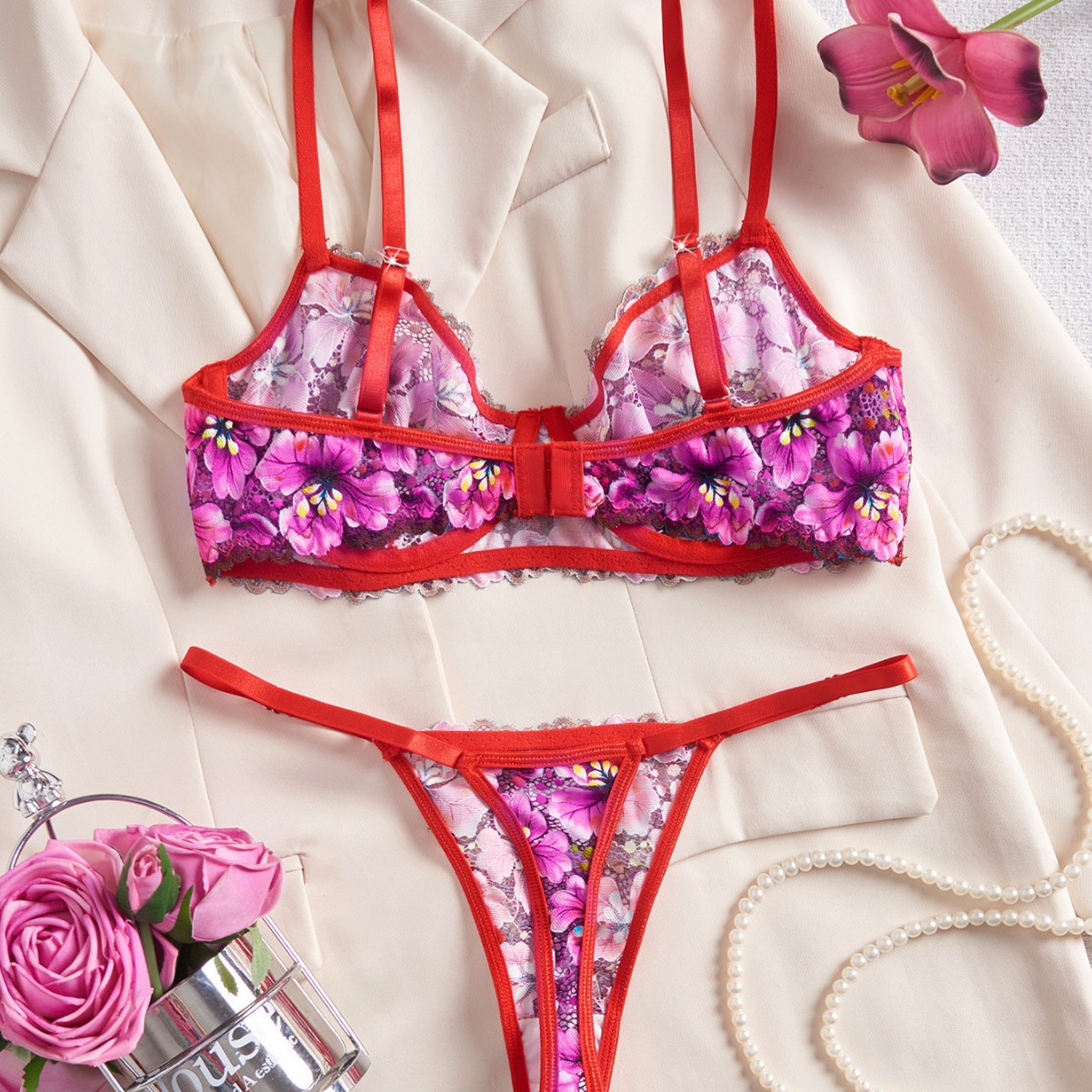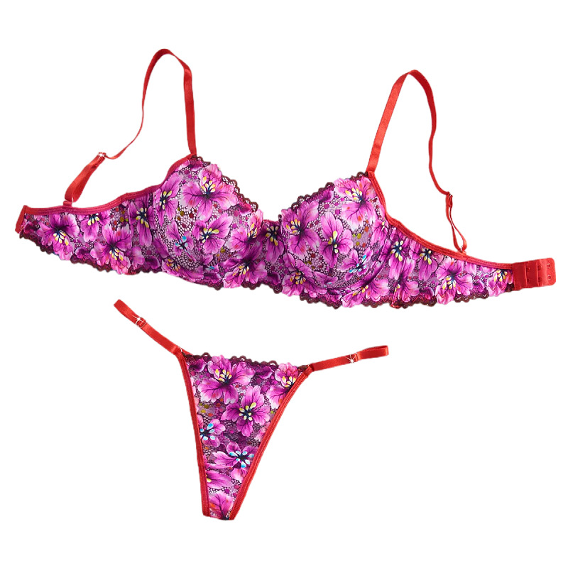 european and american style sexy underwear set retro multicolor lace printed underwired push-up ultra-thin bra cross-border foreign trade wholesale
