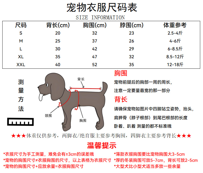 Friendship Tip: For dog and cat clothes with two legs, please measure the chest, and for four-legged clothes, please measure the back length. Do not use weight as the standard for purchasing.