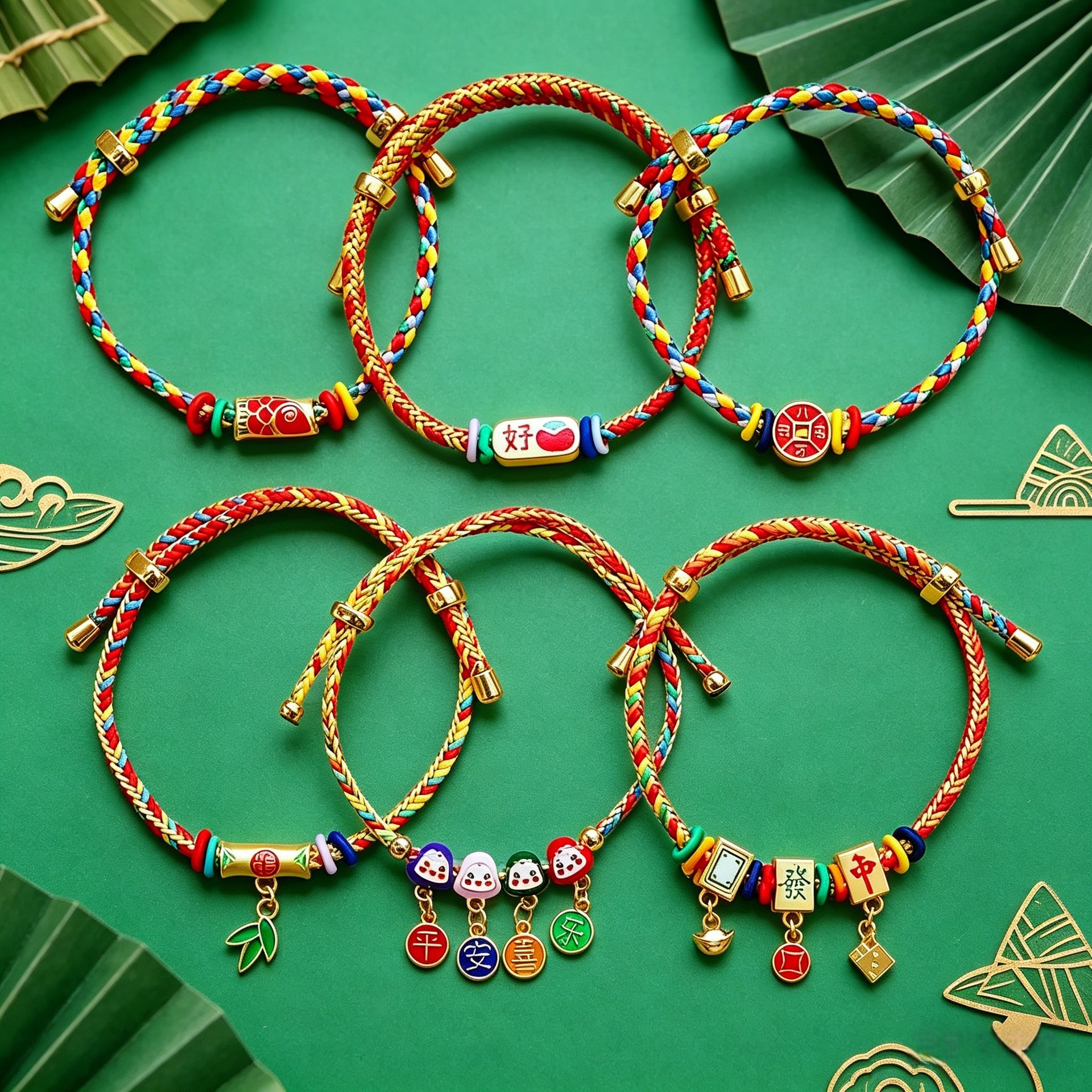 smiling-face green zongzi with lucky bells, ethnic style