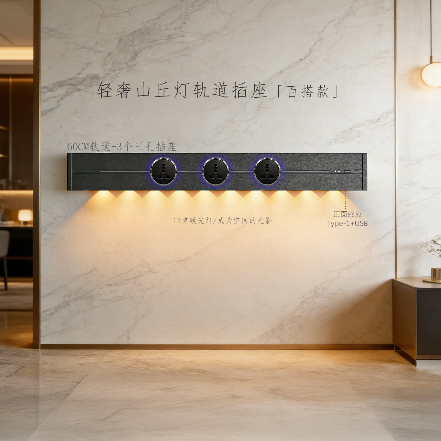 (感应柔光山丘灯)黑色60CM轨道+3个蓝灯多三孔