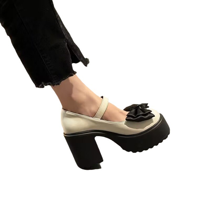 Fashion Bowknot High Heel Leather Shoes for Women 2024 Autumn New Chunky Heel with Skirt Buckle Mary Jane Shoes