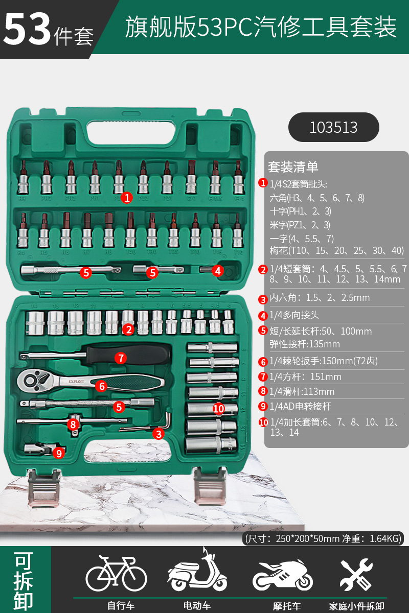 103513 [ultimate 72 teeth] ratchet wrench reinforced 1/4 xiaofei 53-piece set