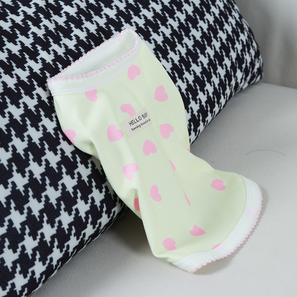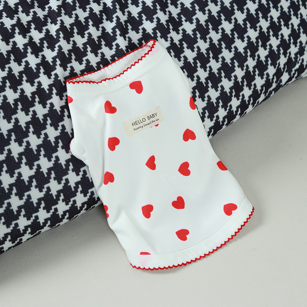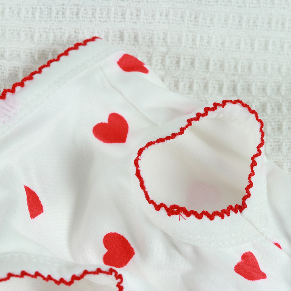 Material description: Polyester, knitted fabric, design with ear-like edges at the cuffs and collar, light and airy, adorable and full of vitality, heart-shaped print, classic white and red contrast color, a must-have for little princesses, yellow is fresh.