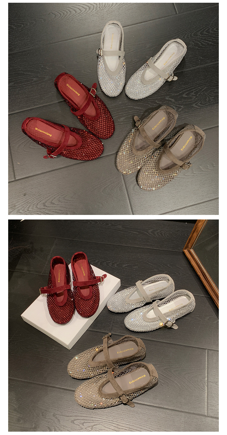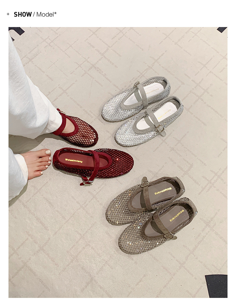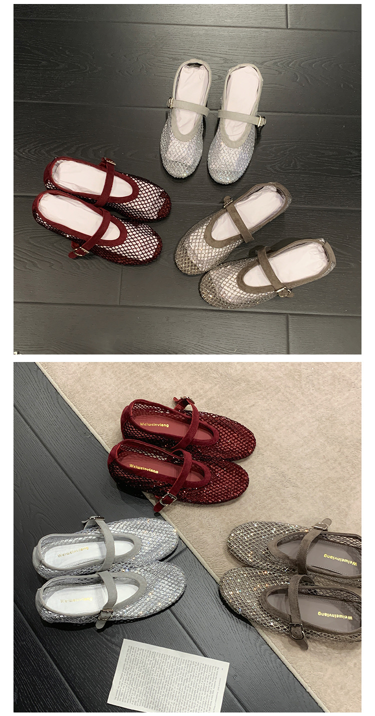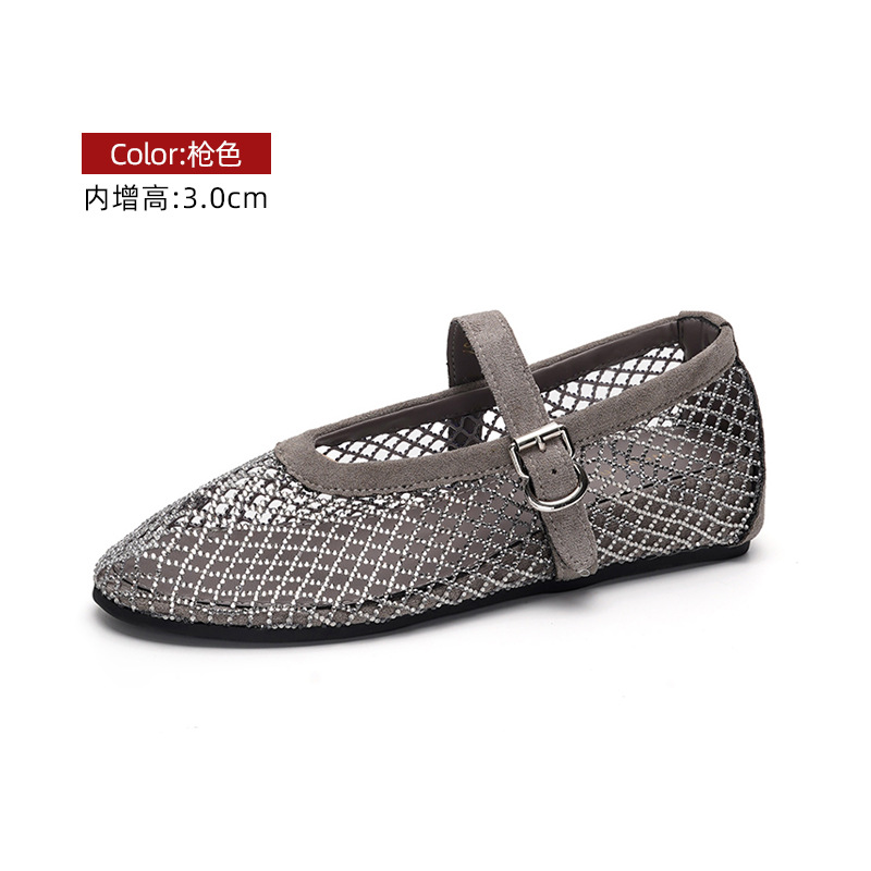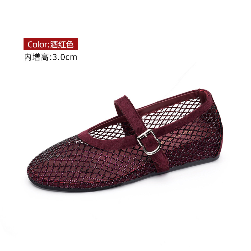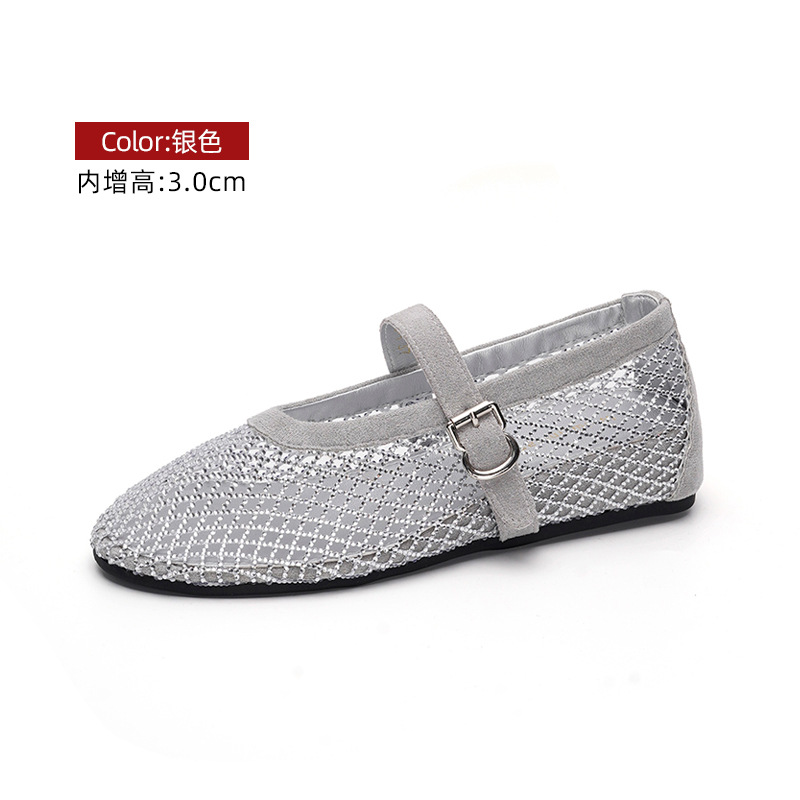 weiwei girl 3368-1 height increasing insole rhinestone mesh shoes women's flat mary jane hollow sandals fishnet shoes