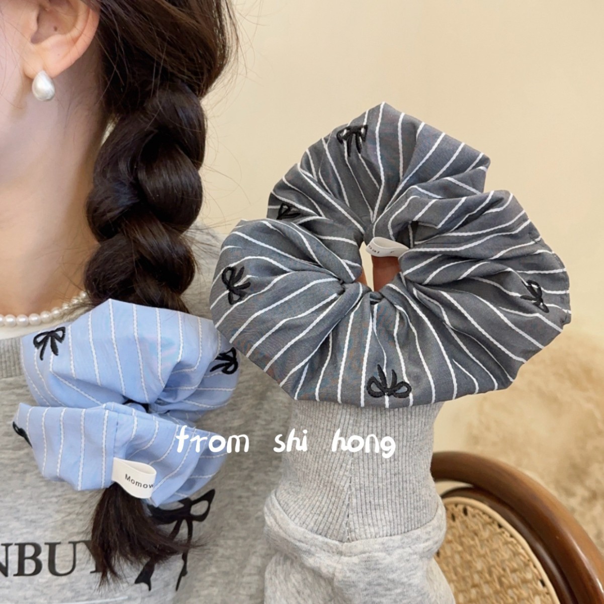 gray-embroidered bow stripes